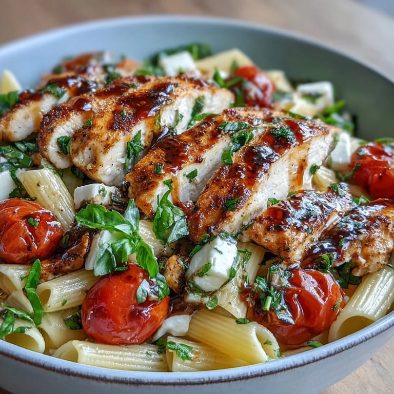 The combination of classic Italian ingredients like cherry tomatoes, fresh basil, mozzarella, and balsamic vinegar with pasta and seared chicken creates an Italian-American fusion that's familiar yet fresh.