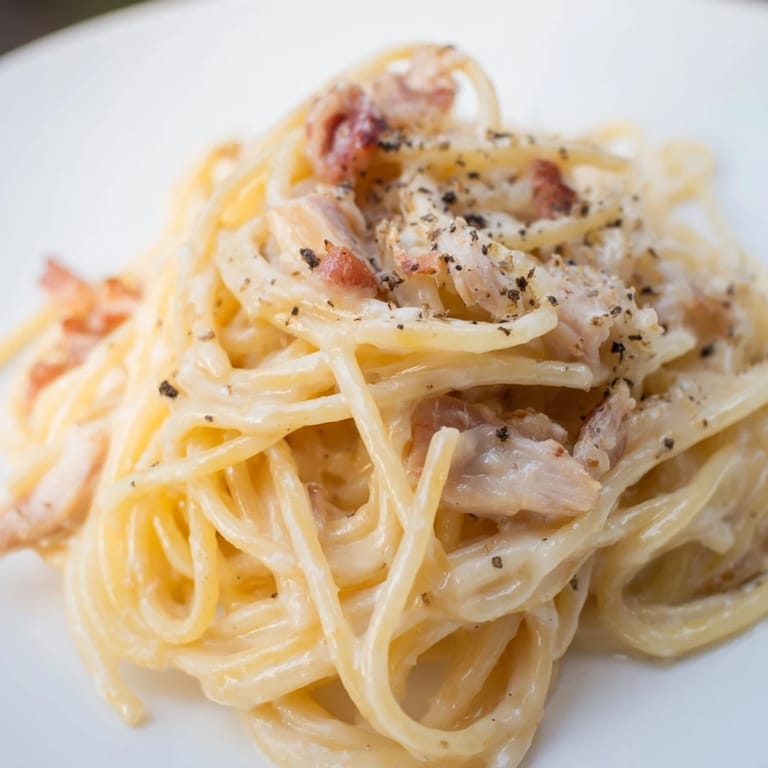 Pin It My roommate burst through the door one rainy Wednesday holding a leftover rotisserie chicken and announcing she was too tired to think. I had bacon in the fridge, dried pasta in the cupboard, and twenty minutes before my next work call. What came together that night wasn't careful or traditional, but it was warm, rich, and gone before we even sat down properly. We ate standing at the counter, twirling forkfuls and laughing at how something this satisfying required almost no planning at all.