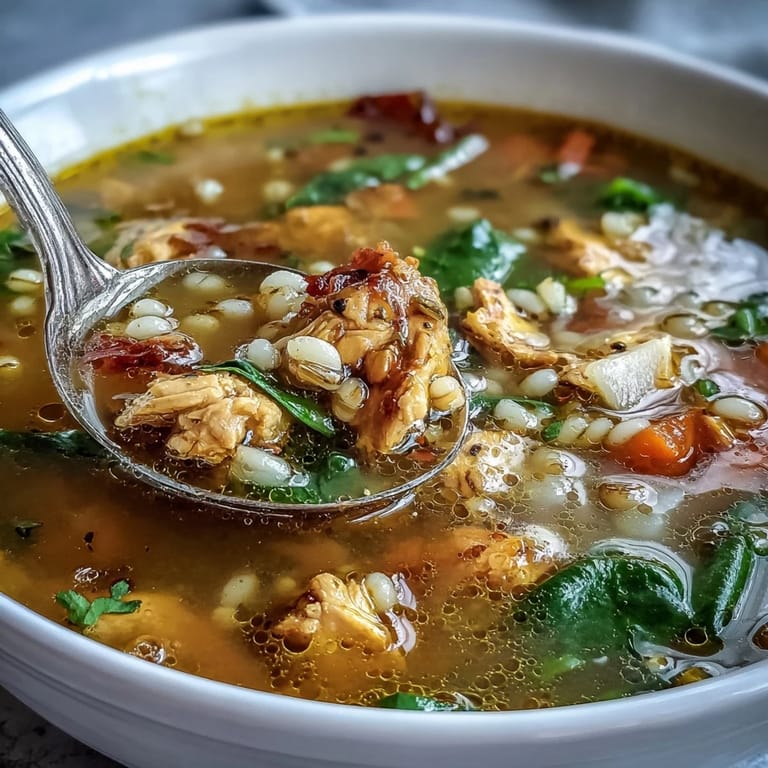 Most people think soup is just broth and vegetables, but pearl barley transforms it into something that actually satisfies—it absorbs all those spiced flavors while adding a gentle chewiness that keeps your spoon interesting. The first time I made this with just broth and chicken, it tasted lovely but somehow felt incomplete, like something was missing. The barley solved a problem I didn't know I had. If barley isn't in your pantry, farro works beautifully too, or even brown rice if you shorten the cooking time slightly and adjust liquid amounts accordingly.